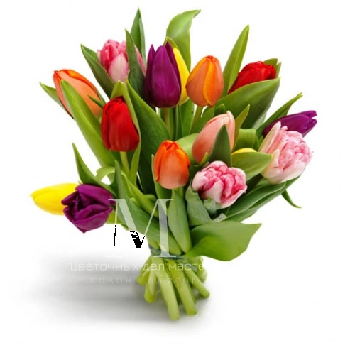 Ароматный и яркий букет из15 разноцветных тюльпанов