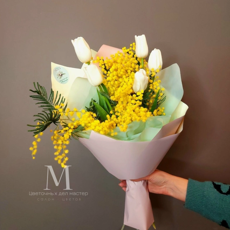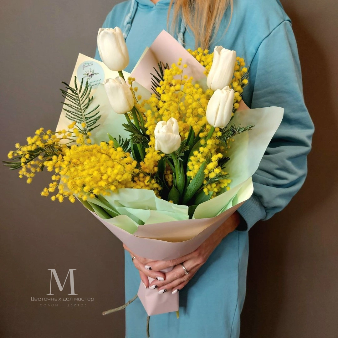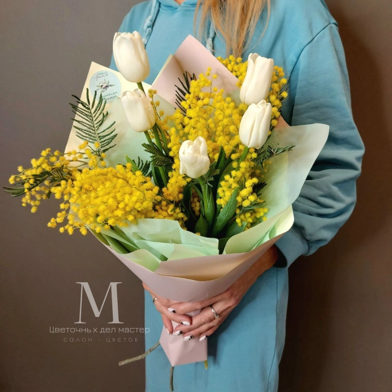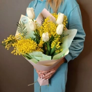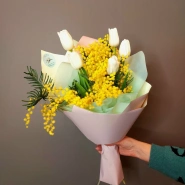 Букет с мимозой и тюльпанами несёт весеннее настроение. По желанию цвет тюльпанов можно заменить на другой.