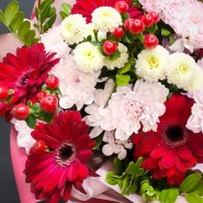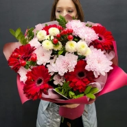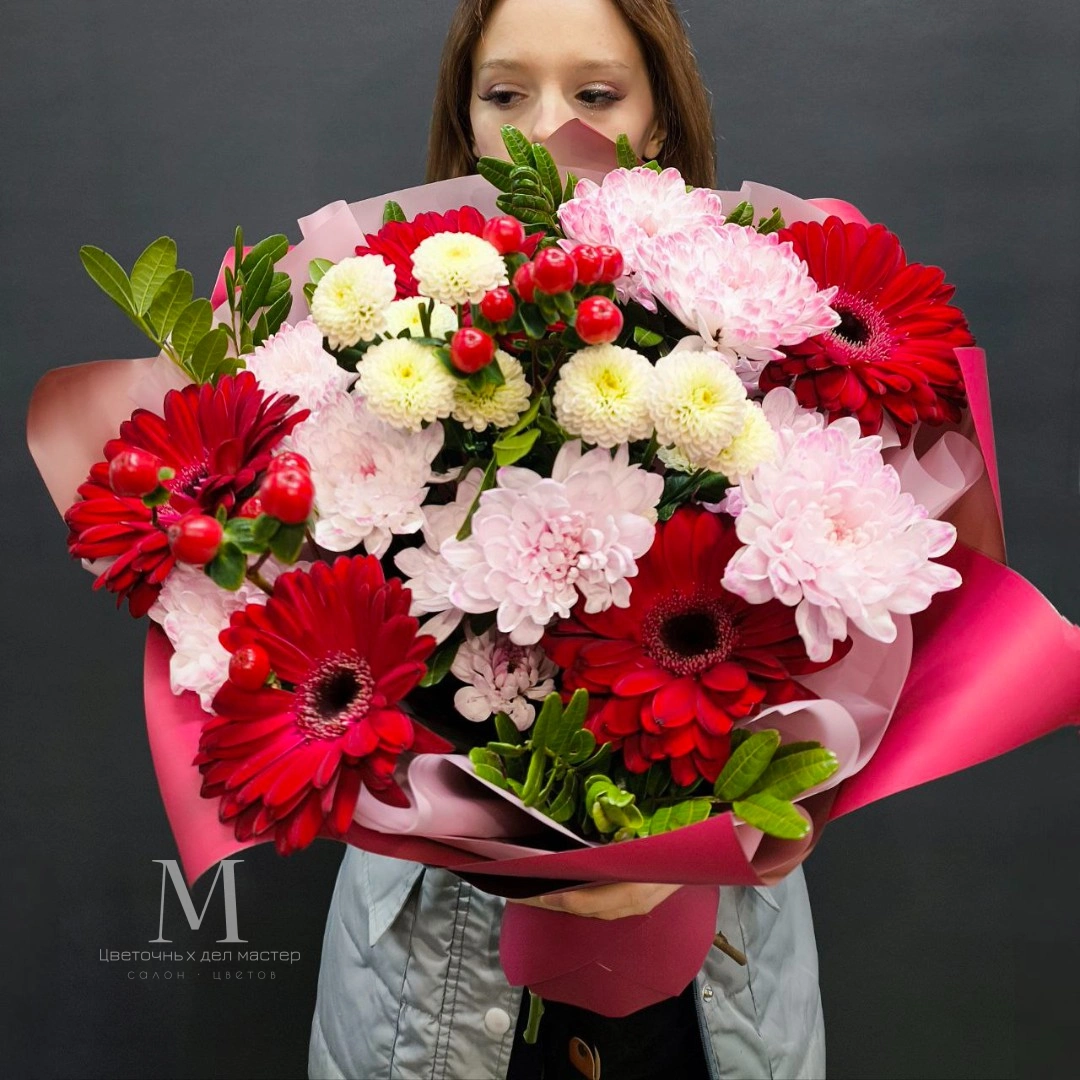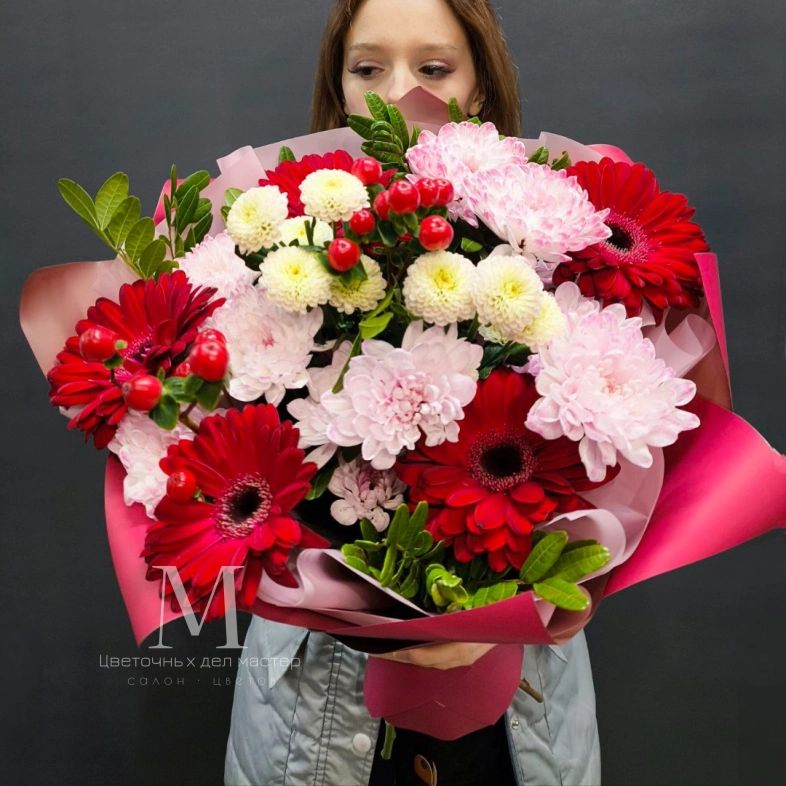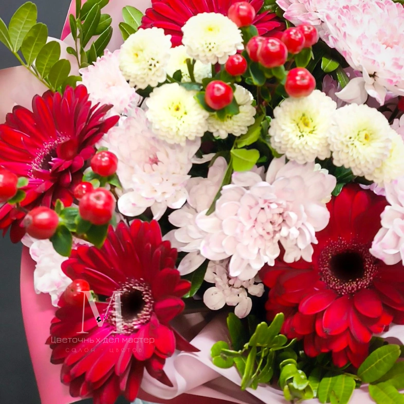Яркий букет, состоящий из насыщенно-красных гербер и нежных розовых хризантем, представляет собой идеальное сочетание страсти и мягкости.