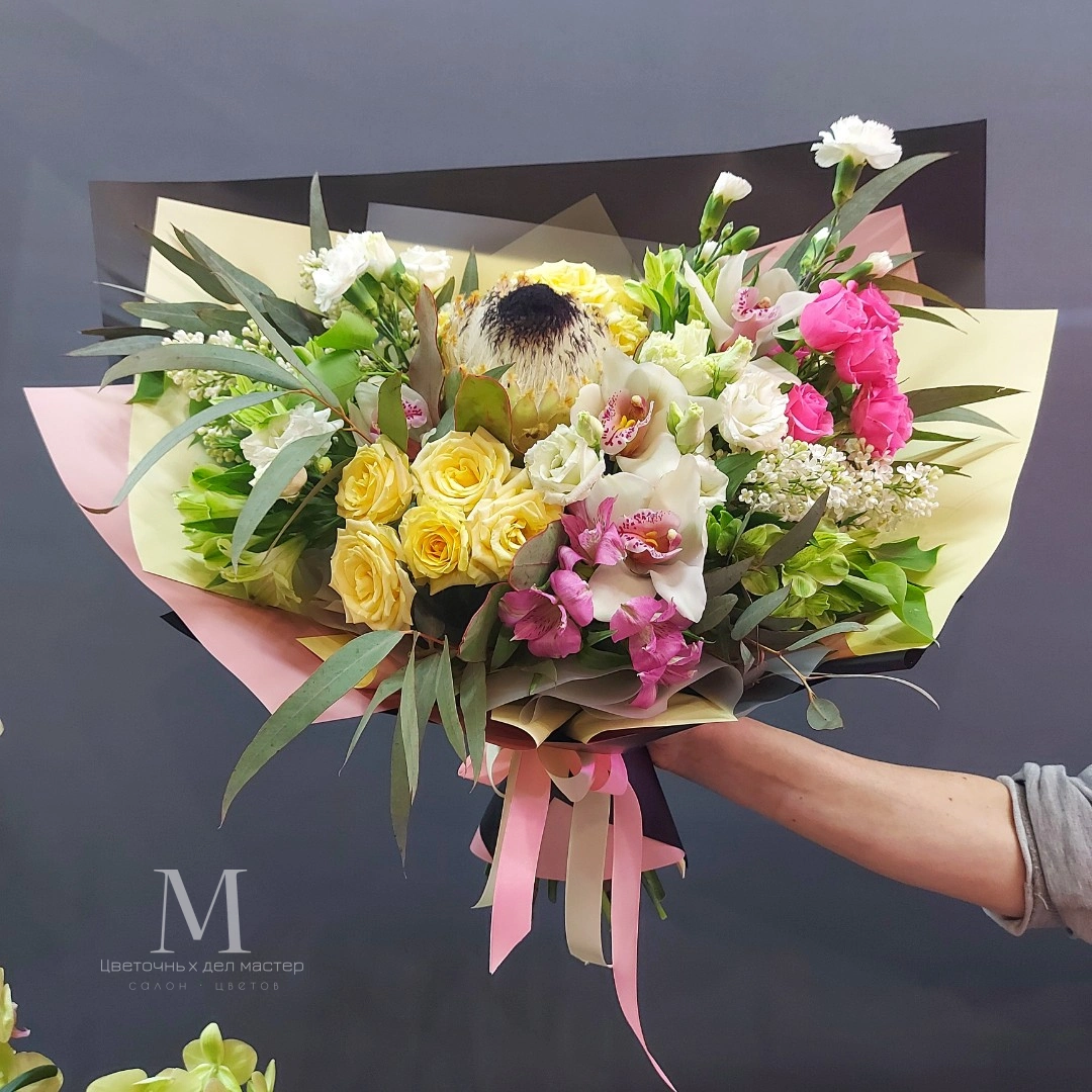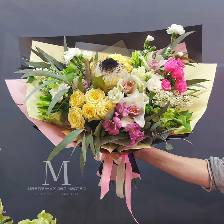Королевский букет с её величеством Протеей во главе, создаст роскошную элегантность и изящество на любом торжестве. Состав букета может незначительно отличаться от фото.