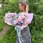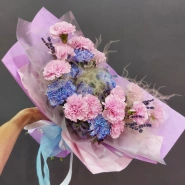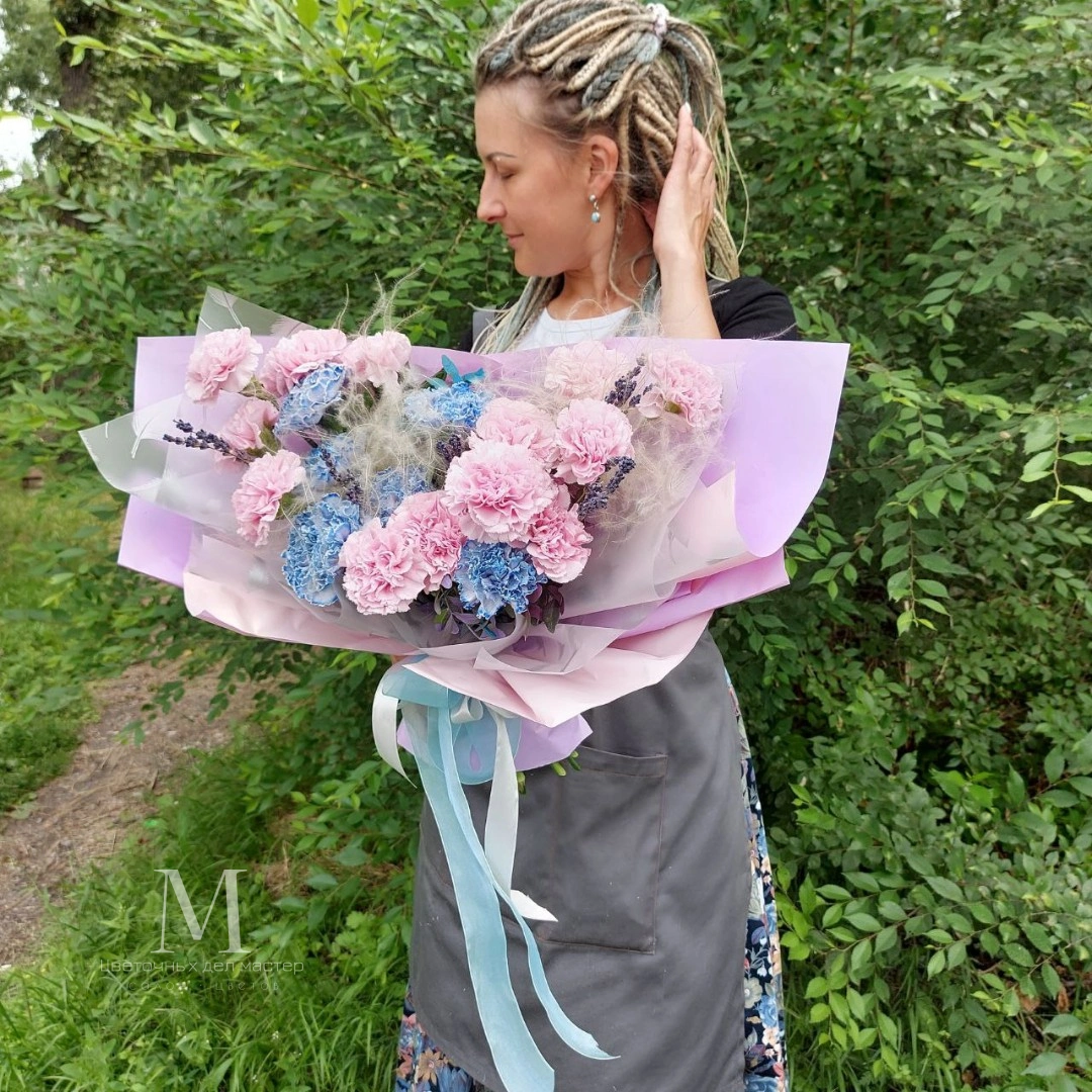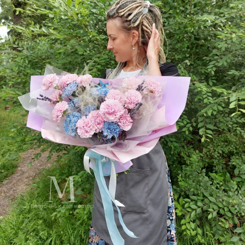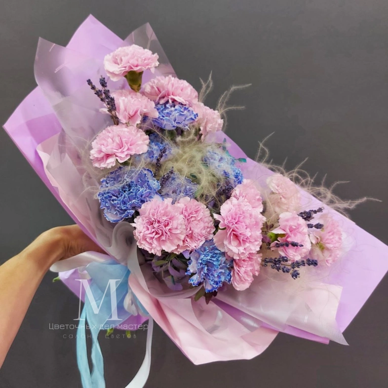 Трогательное сочетание розового и голубого Диантуса (Гвоздики), делает букет по истине невесомым, воздушным, нежным и запоминающимся.
