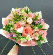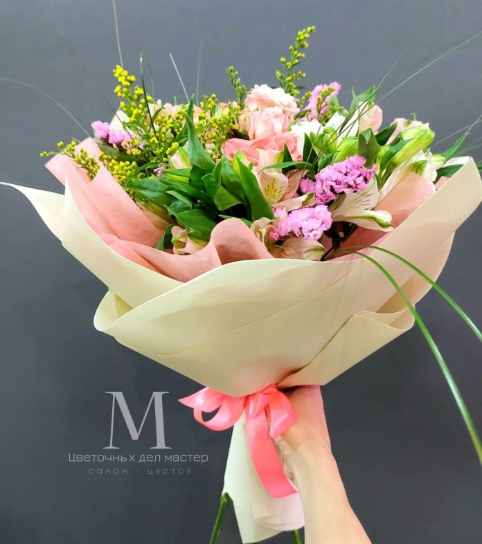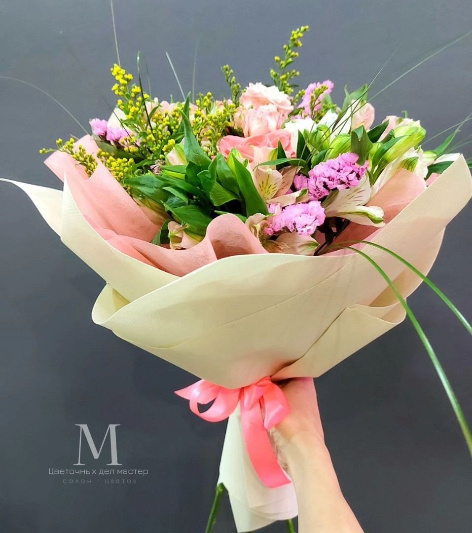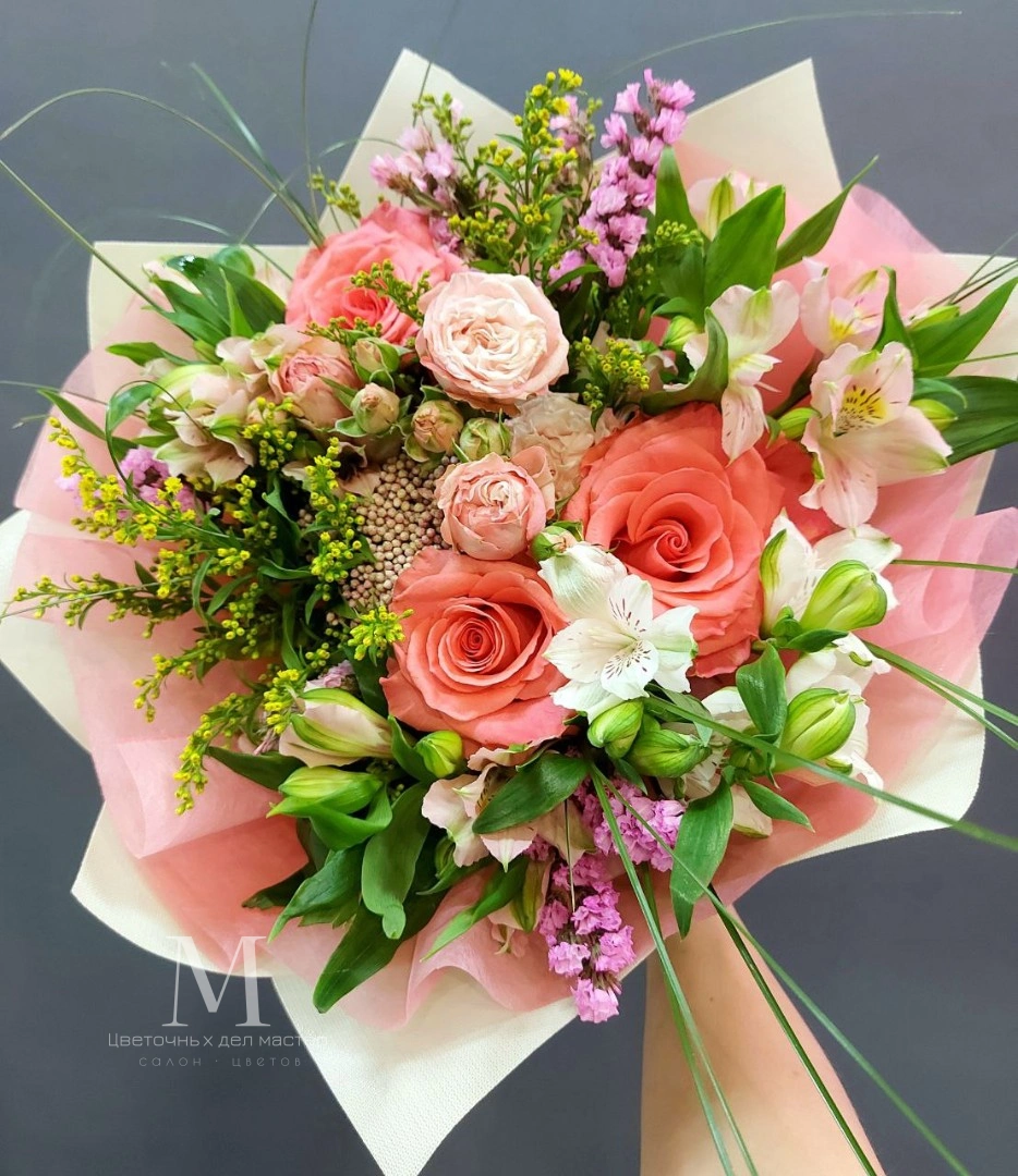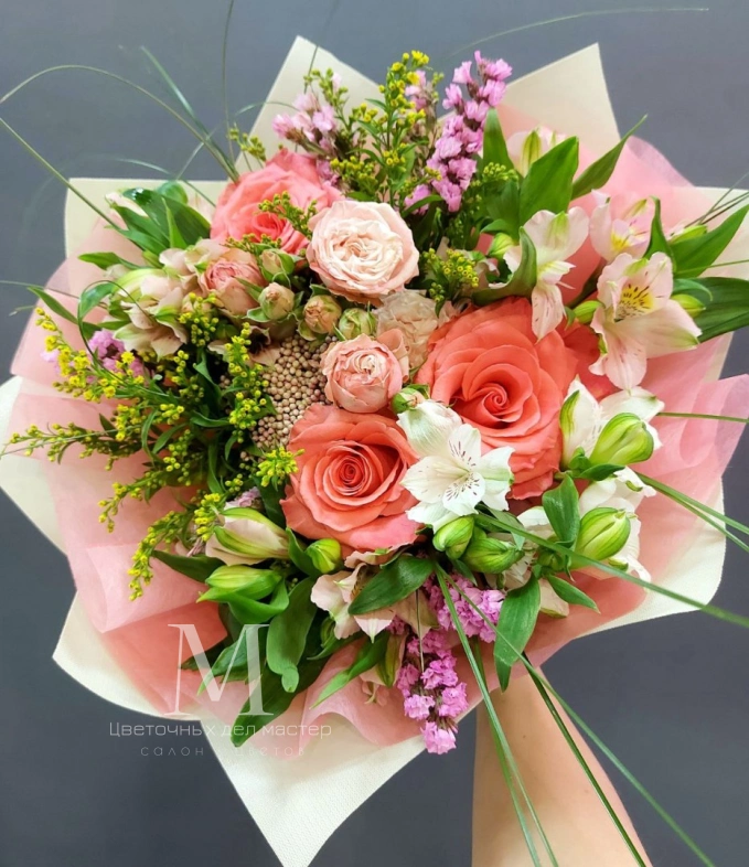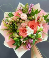 Авторский букет в тёплой розовой гамме с розами и альстромериями.