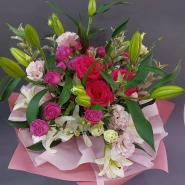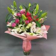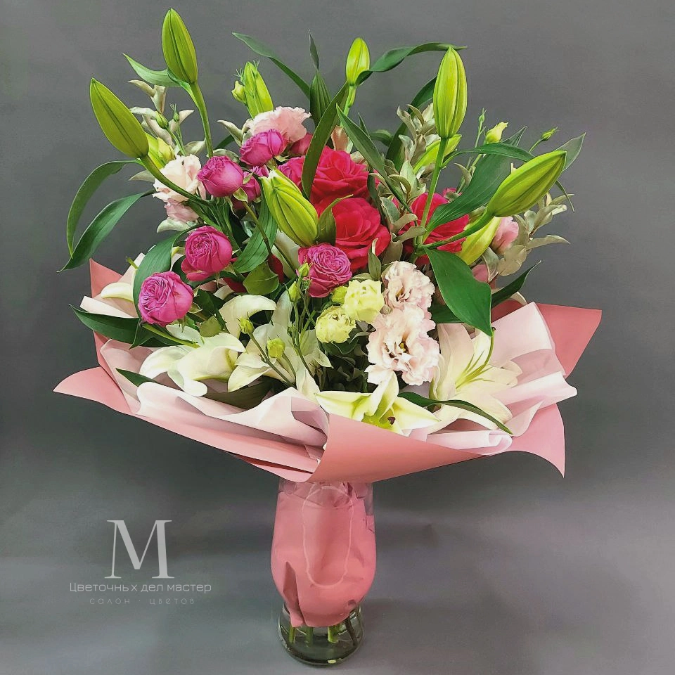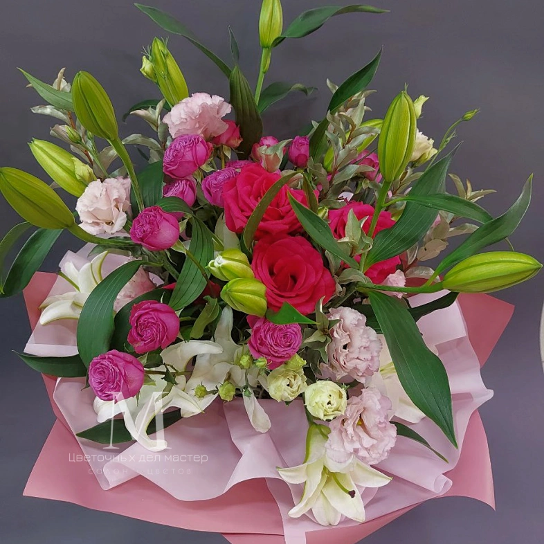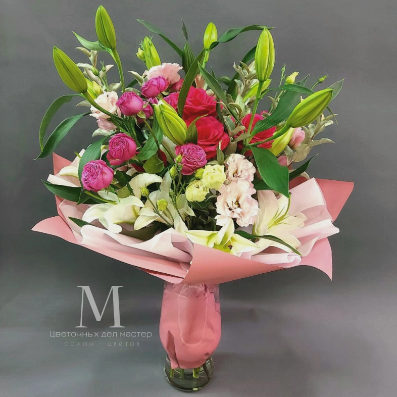 Этот великолепный букет составлен из изящных лилий, нежных роз и изысканных эустом. Каждый цветок в этом композиции является символом красоты, любви и изящества.