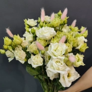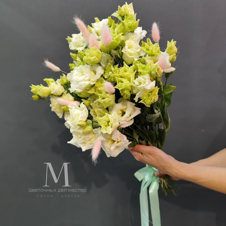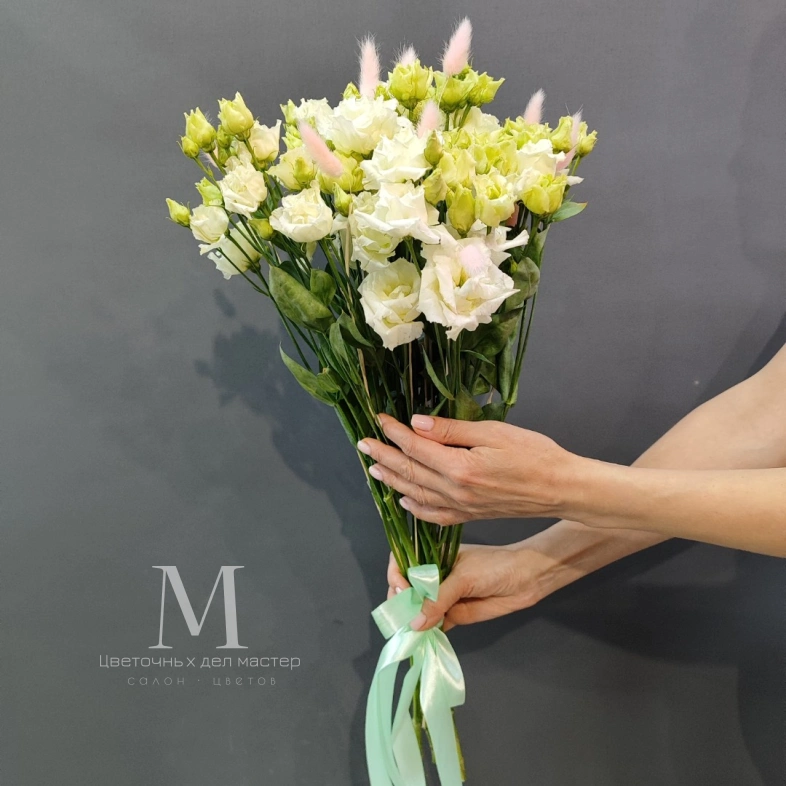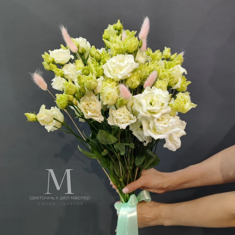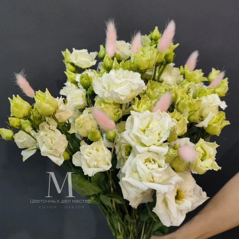 Вдохновение и чистота в одном букете - встречайте нашу прекрасную композицию из 7 белых эустом, которые гармонично дополняют розовый лагурус. Этот восхитительный букет символизирует совершенство и чистоту души.