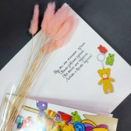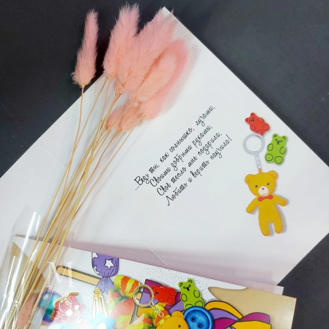 На открытке изображены конфеты и игрушки, а также трогательные слова, которые передают всю нежность и заботу