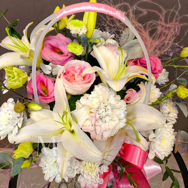 Эта композиция - воплощение нежности и изящества, идеальное сочетание для любого торжества. Нежные оттенки розовых и белых цветов, дополненные яркими акцентами, создают гармоничную композицию, которая обязательно произведет впечатление. Букет станет прекрасным подарком для близких или украшением для вашего мероприятия.