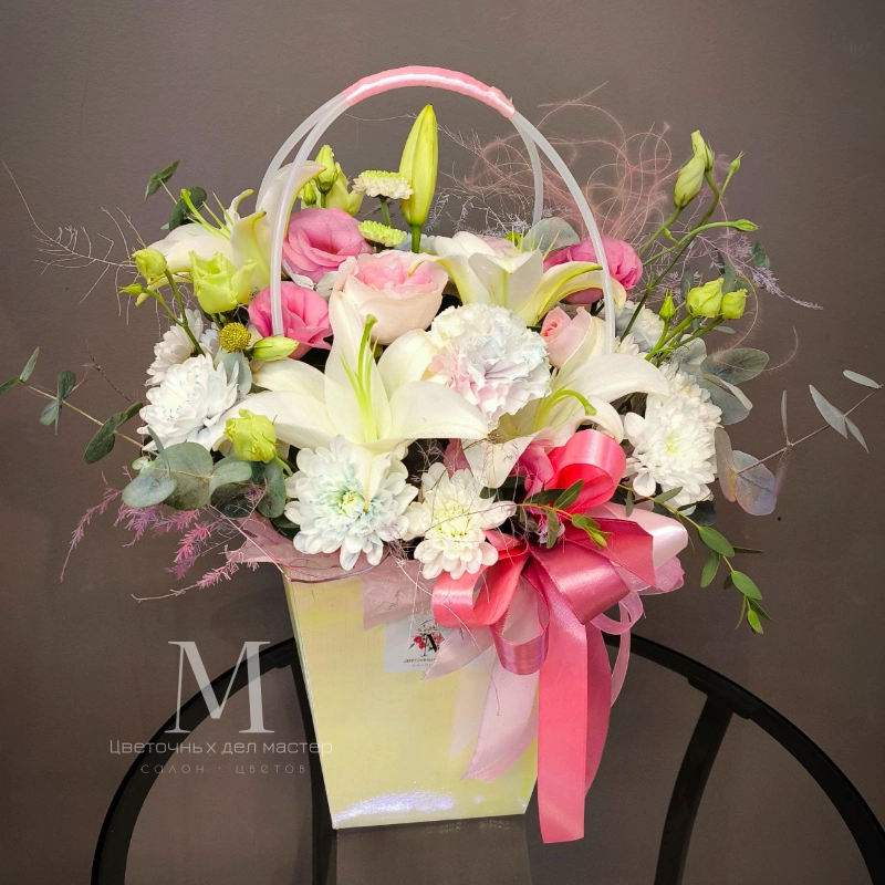 ГлавнаяКаталогКомпозицииКомпозиция в сумочке «Нежное очарование»