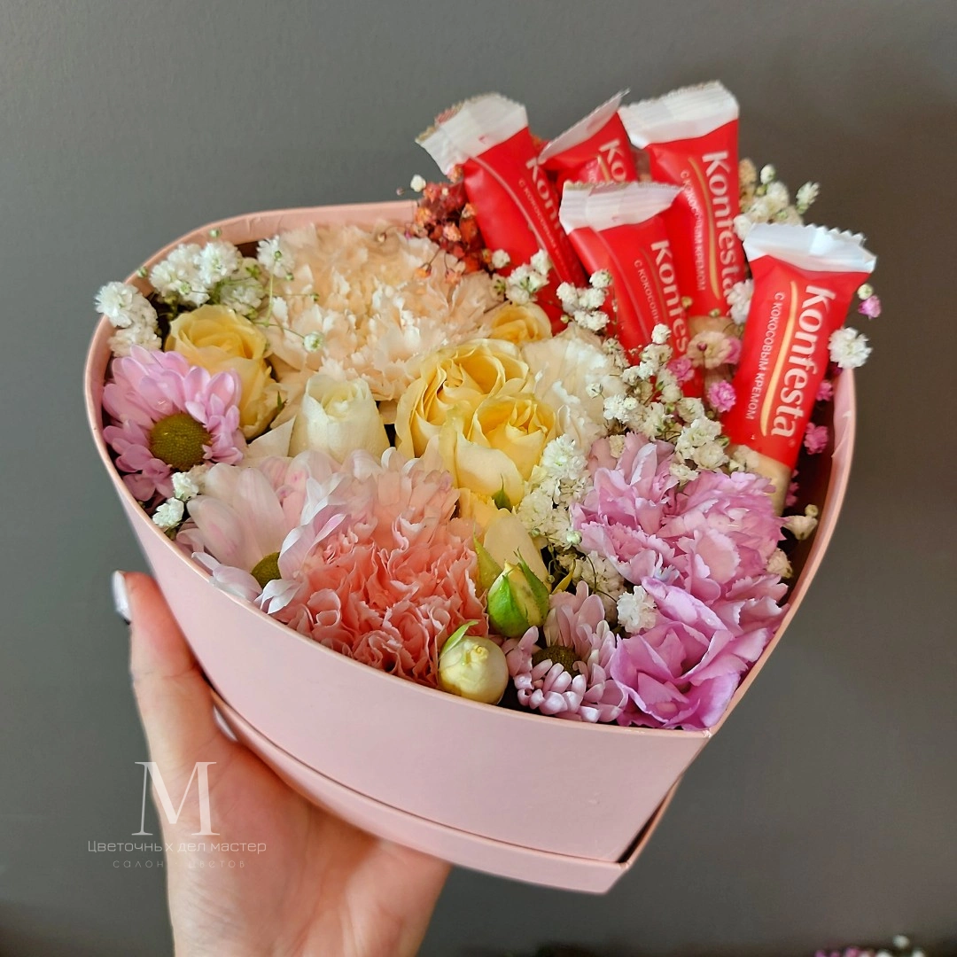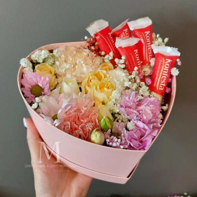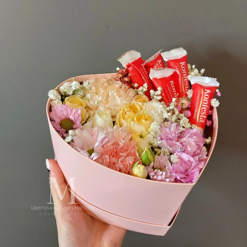 ГлавнаяКаталогКомпозицииВ коробкеКомпозиция «Нежное сердечко»