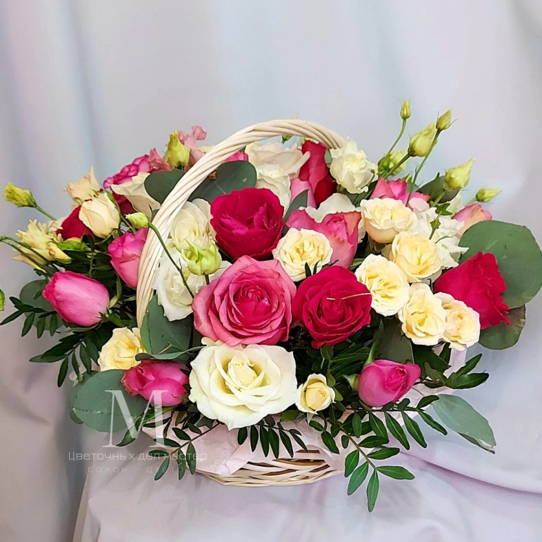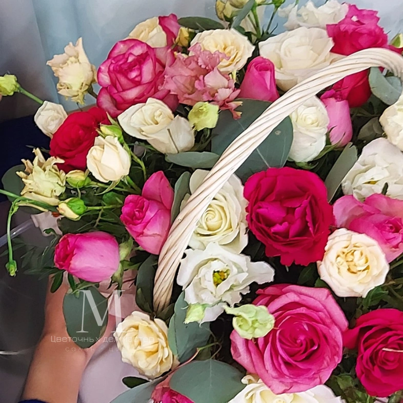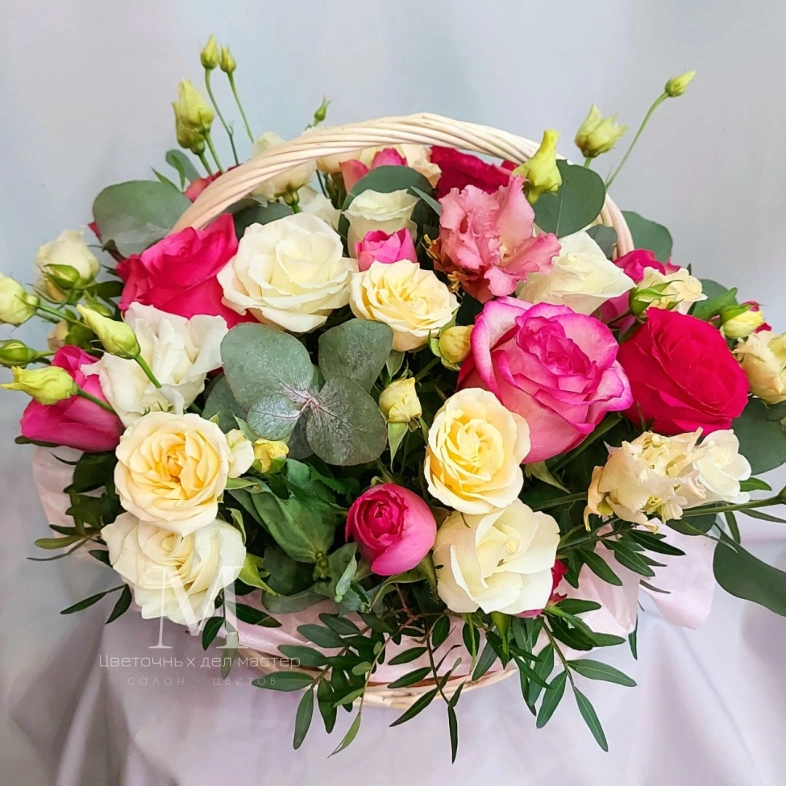 Корзина из роз с эустомами – это элегантное и изысканное решение для создания неповторимого подарка или украшения интерьера. В этой композиции сочетаются красота и нежность роз с изящностью и легкостью эустом.