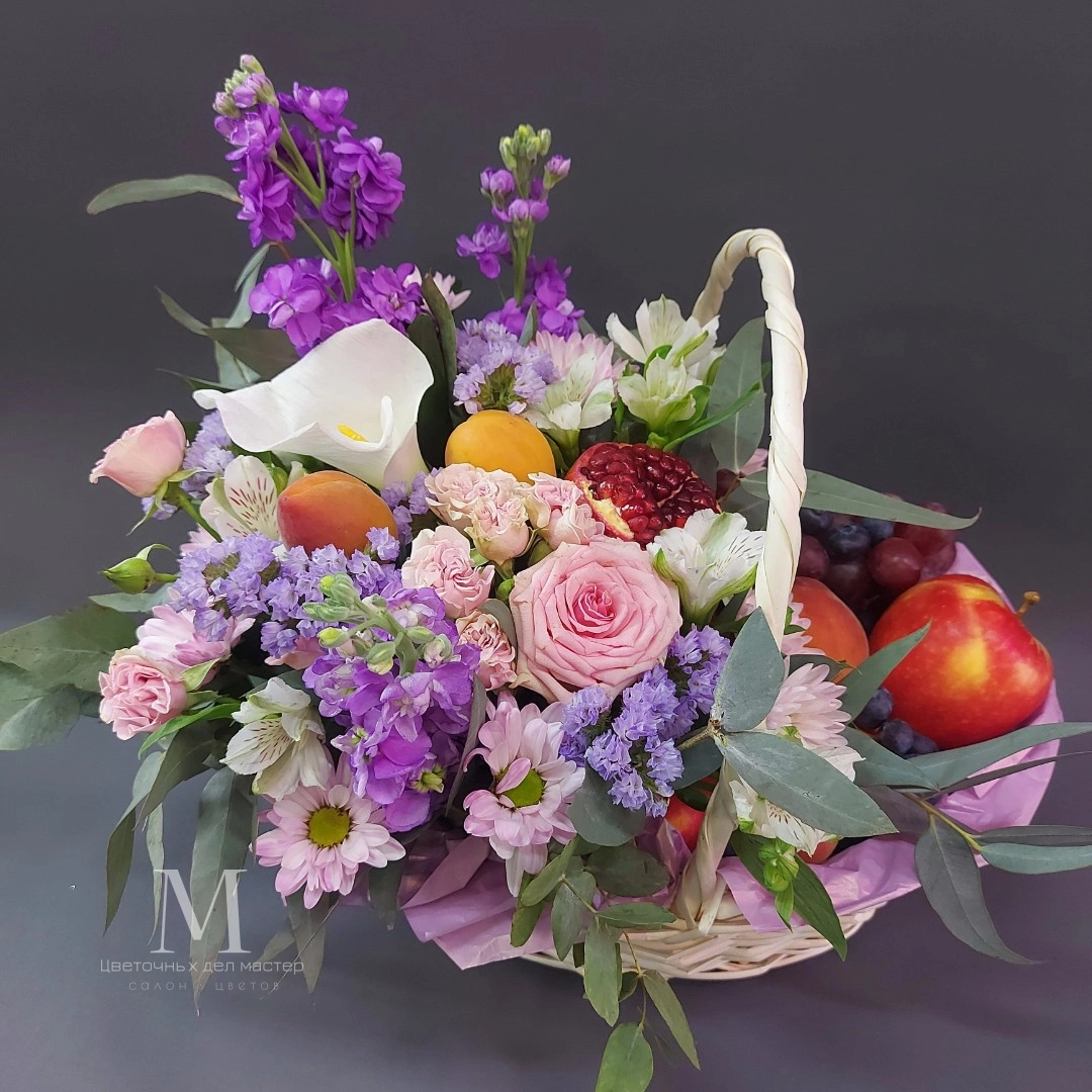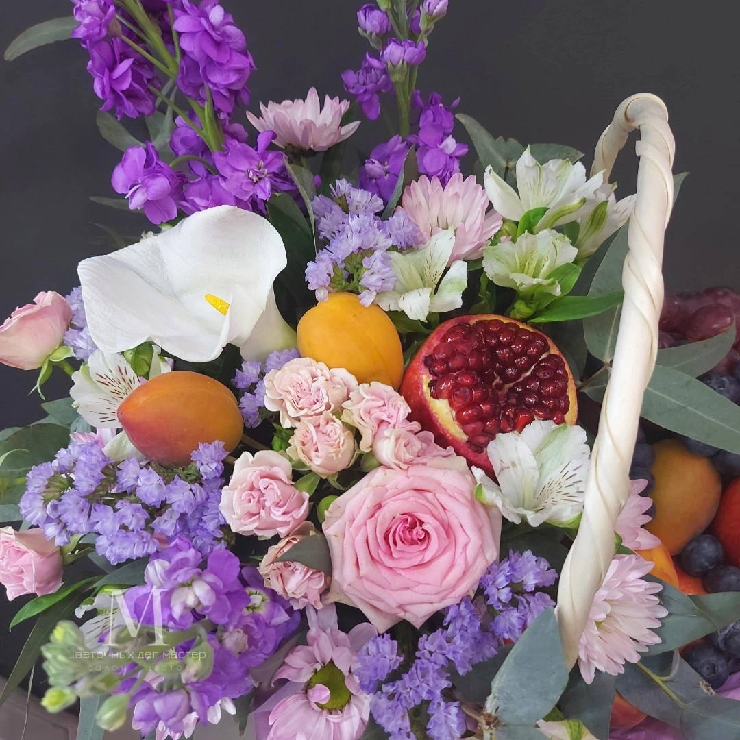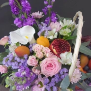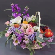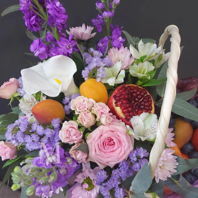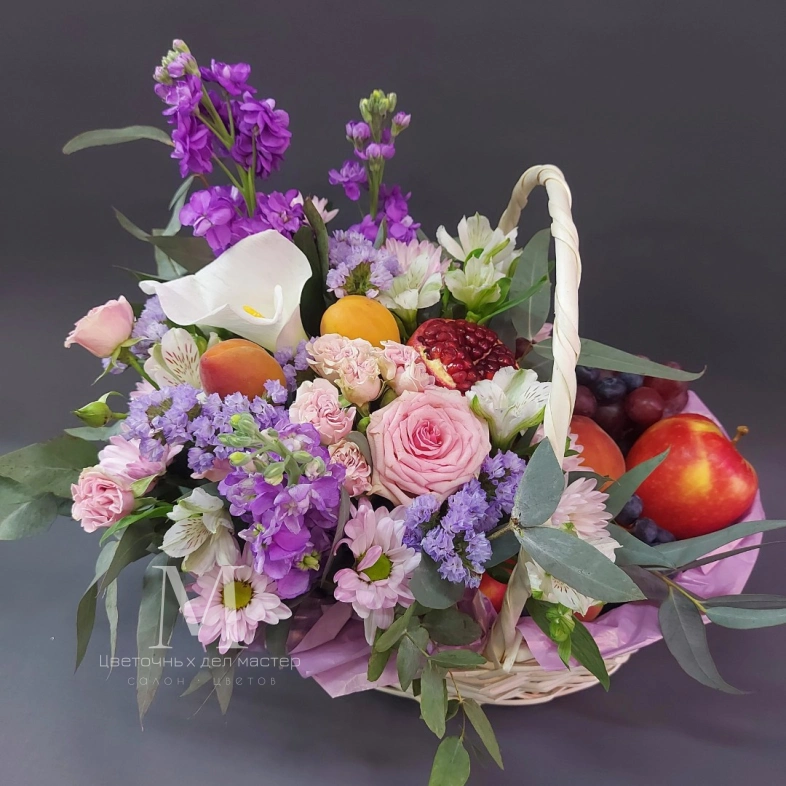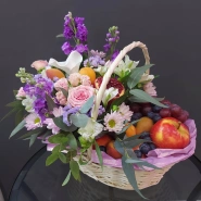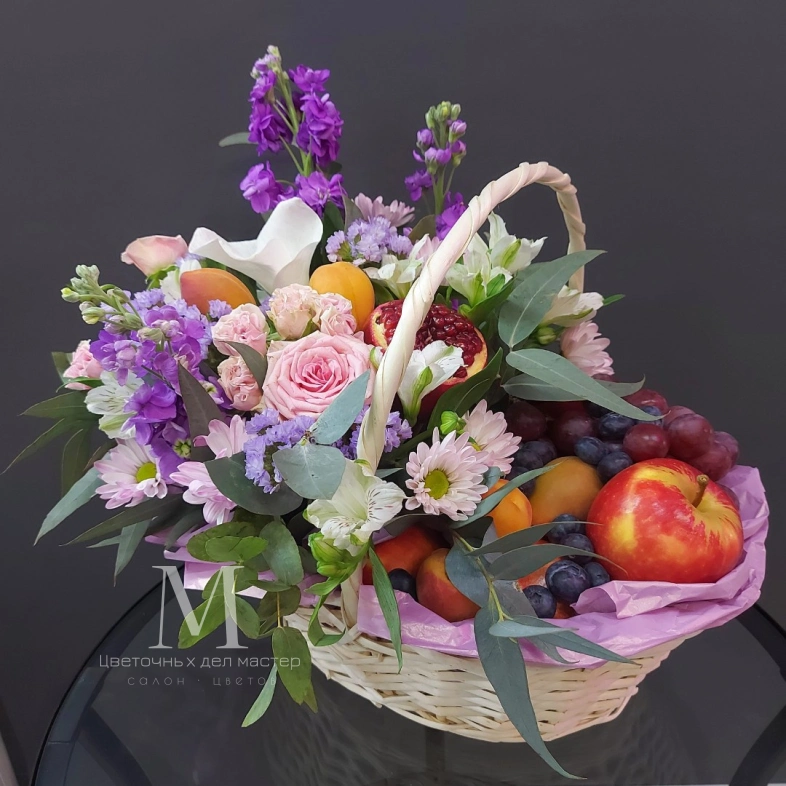 Эта корзинка наполнена яркими и ароматными цветами, которые создают атмосферу свежести и радости. Рядом с цветами располагаются сочные и спелые фрукты, которые добавляют корзинке не только визуальную привлекательность, но и полезность.