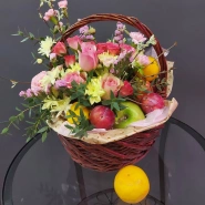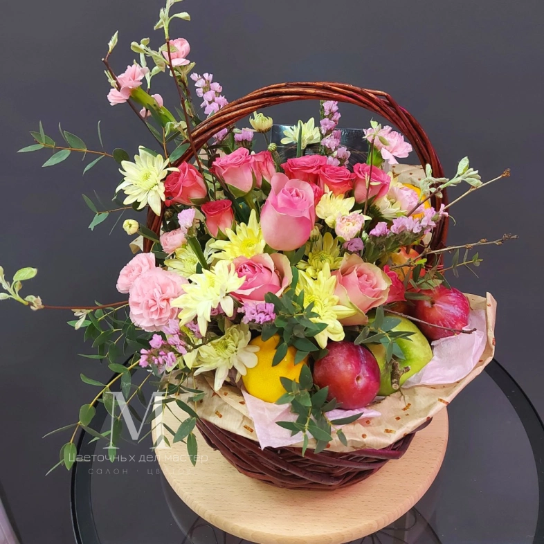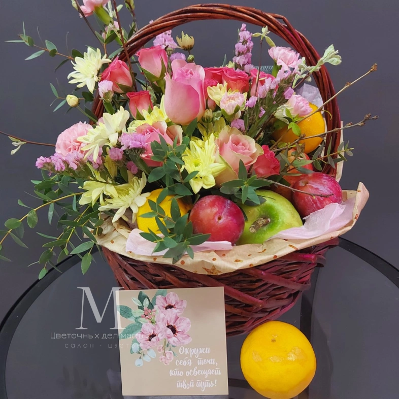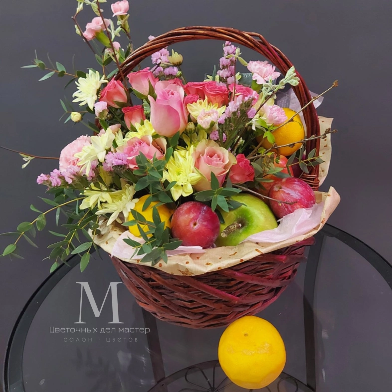 Сочетание цветов и фруктов в корзинке - полезный и яркий подарок на любой праздник!