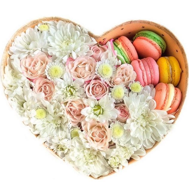 Нежная композиция в виде сердца из роз и хризантем с печеньем