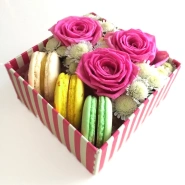 ГлавнаяКаталогКомпозицииСладкиеПеченье и цветы к квадратной коробке