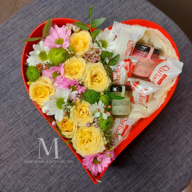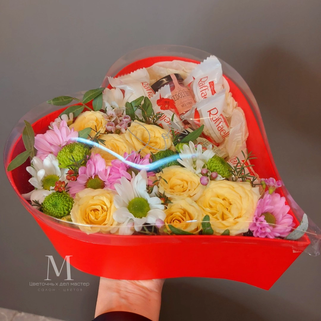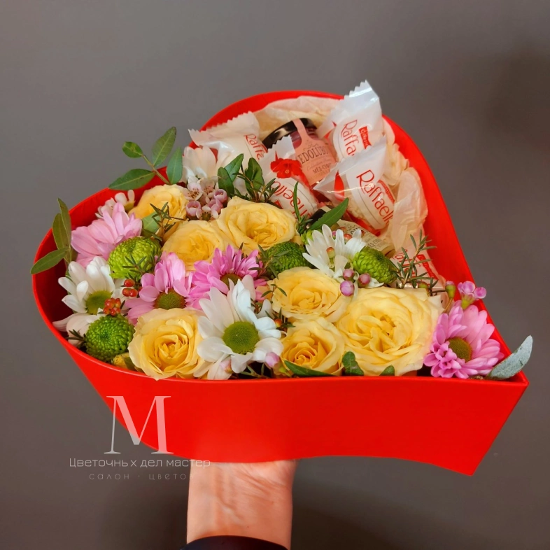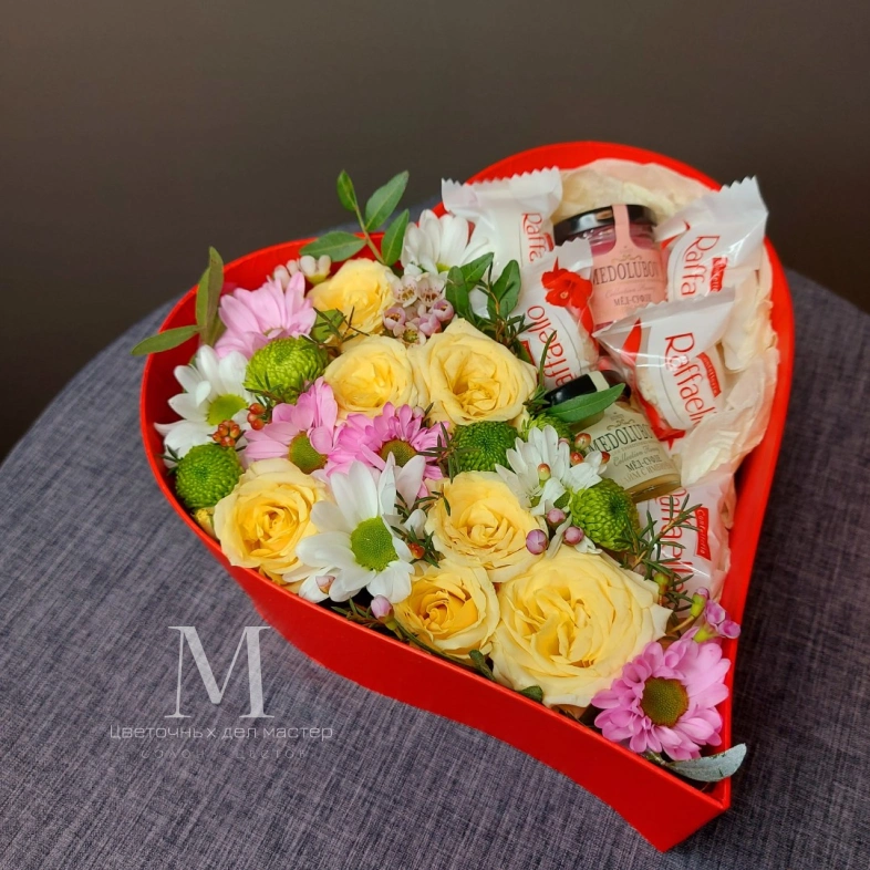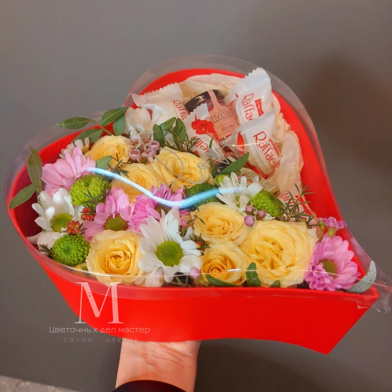 Цветочная композиция в коробочке в форме сердца - это идеальный подарок для особых моментов, таких как День рождения, День Святого Валентина или просто для того, чтобы выразить свою любовь и заботу о близких людях.