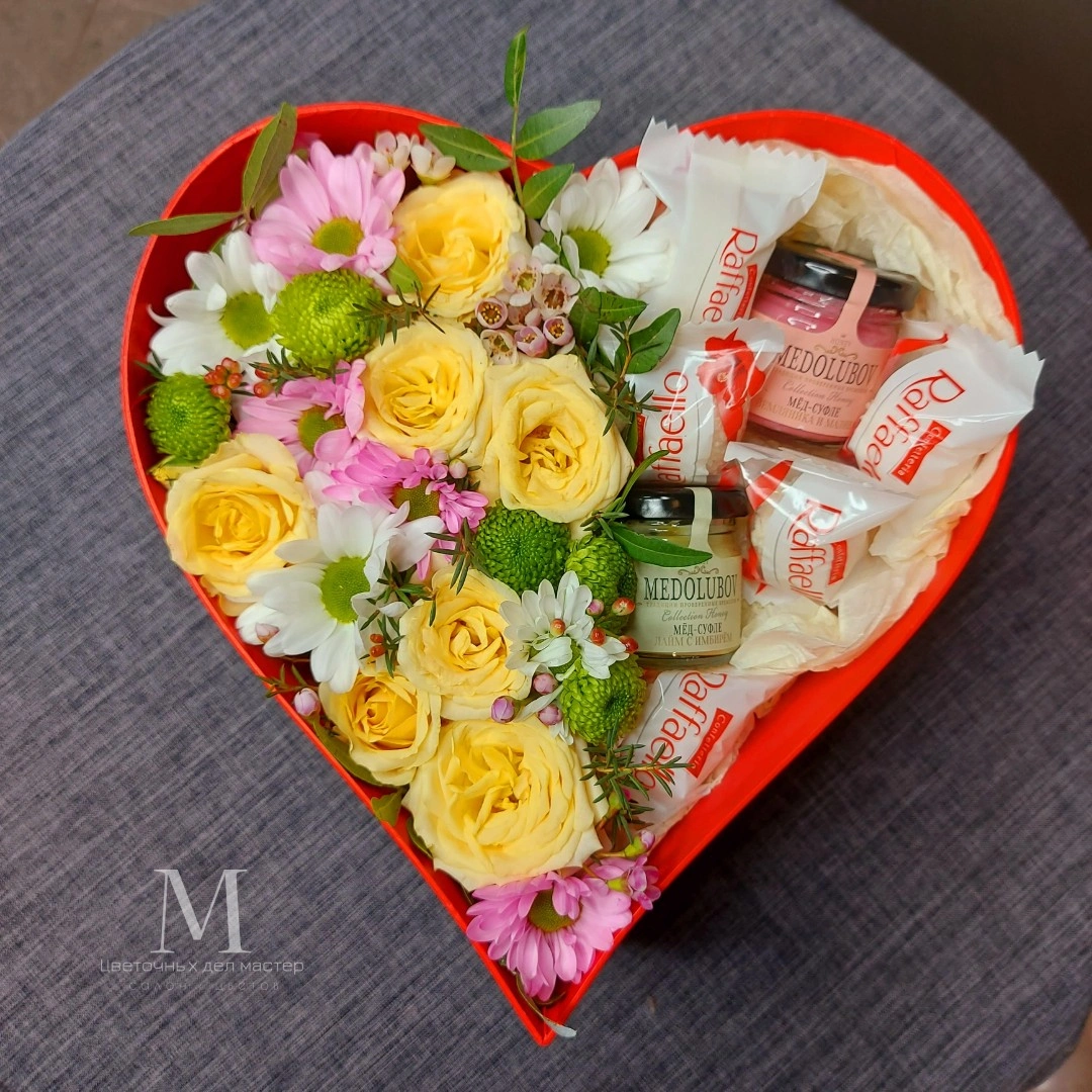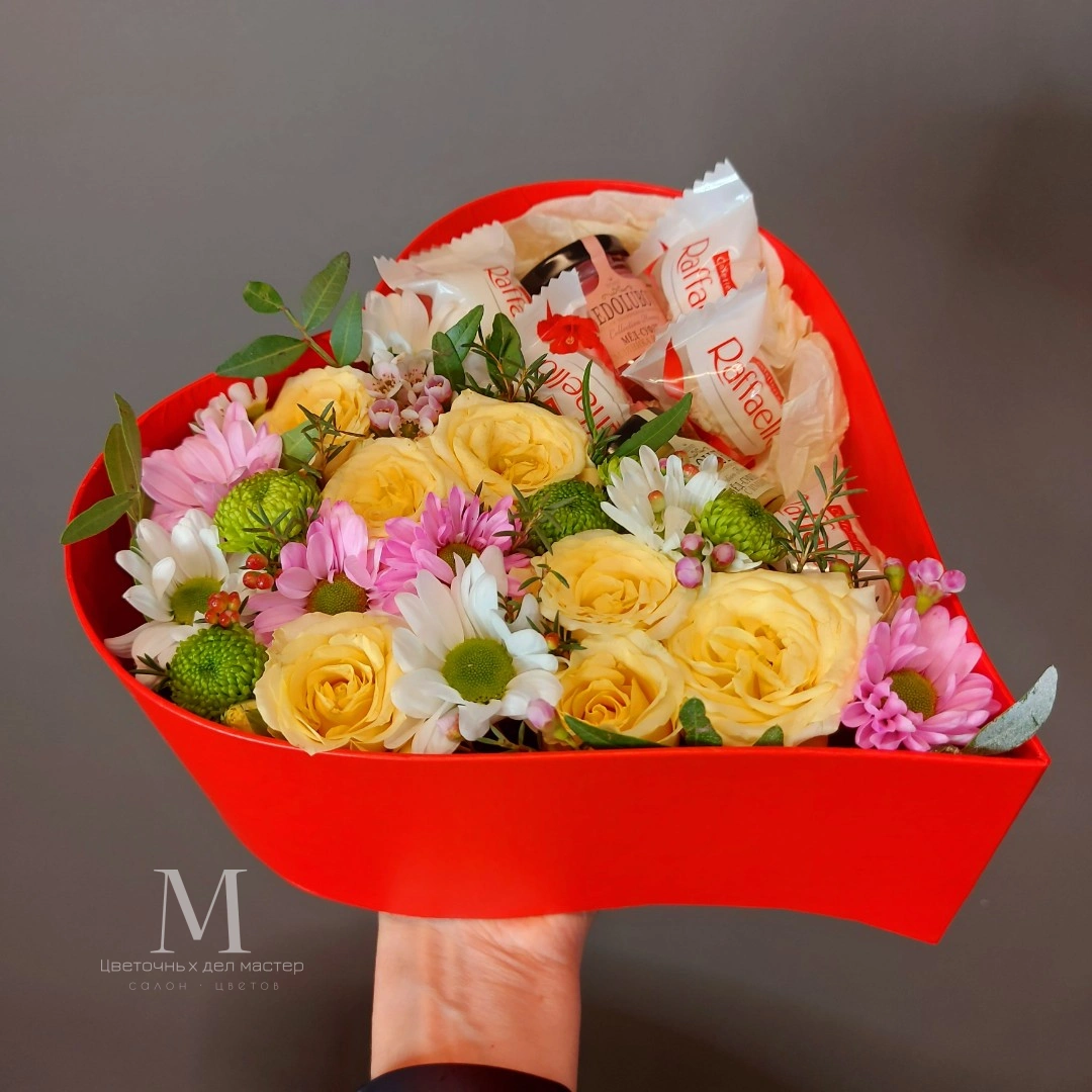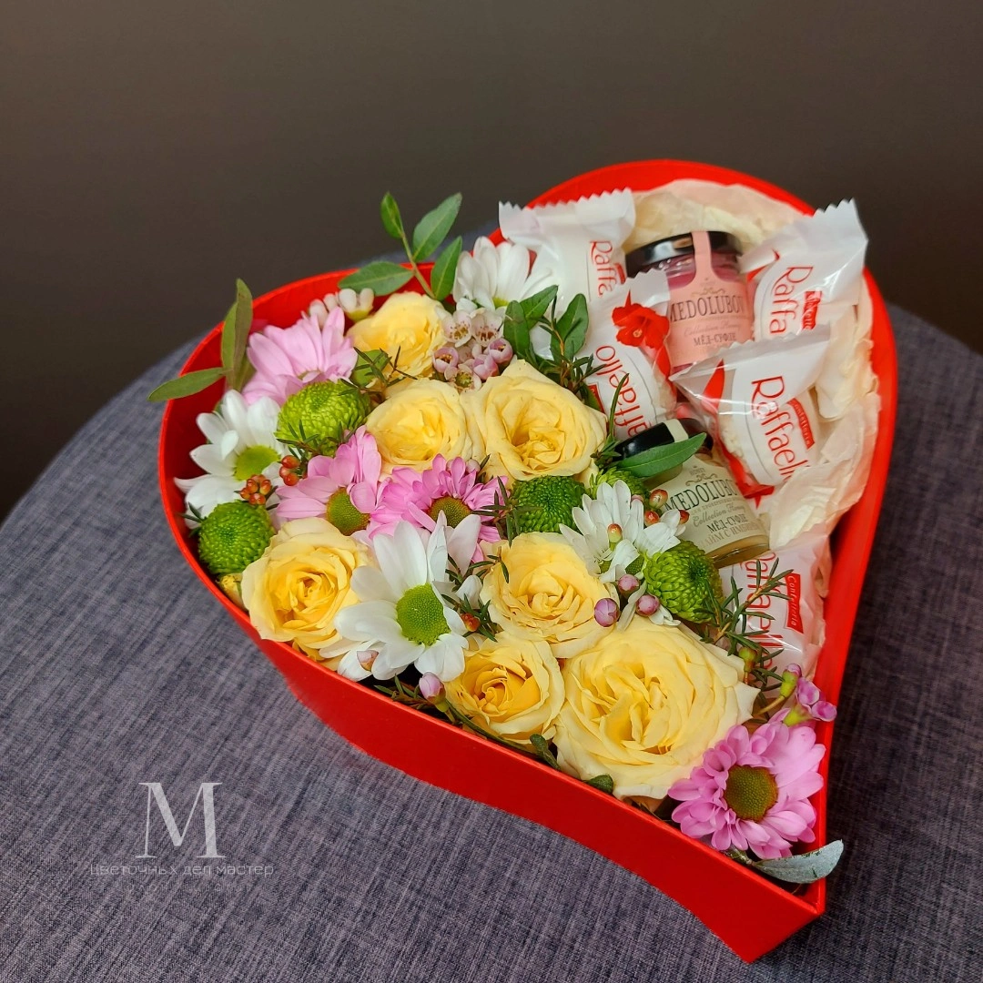 Цветочная композиция в коробочке в форме сердца - это идеальный подарок для особых моментов, таких как День рождения, День Святого Валентина или просто для того, чтобы выразить свою любовь и заботу о близких людях.