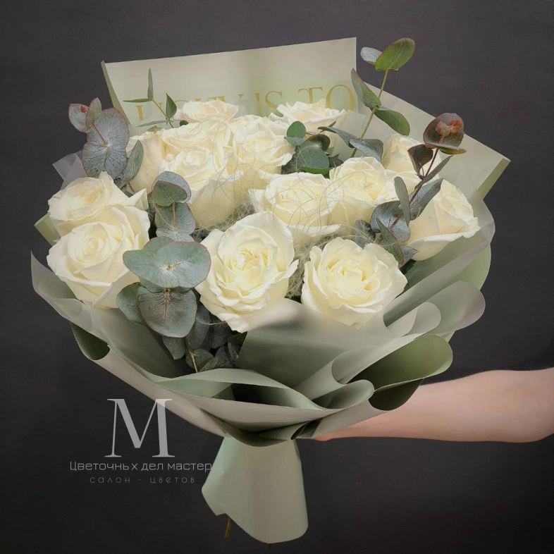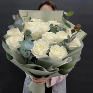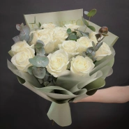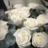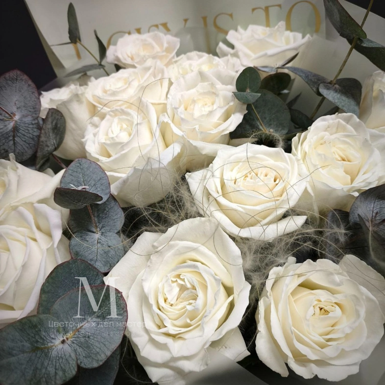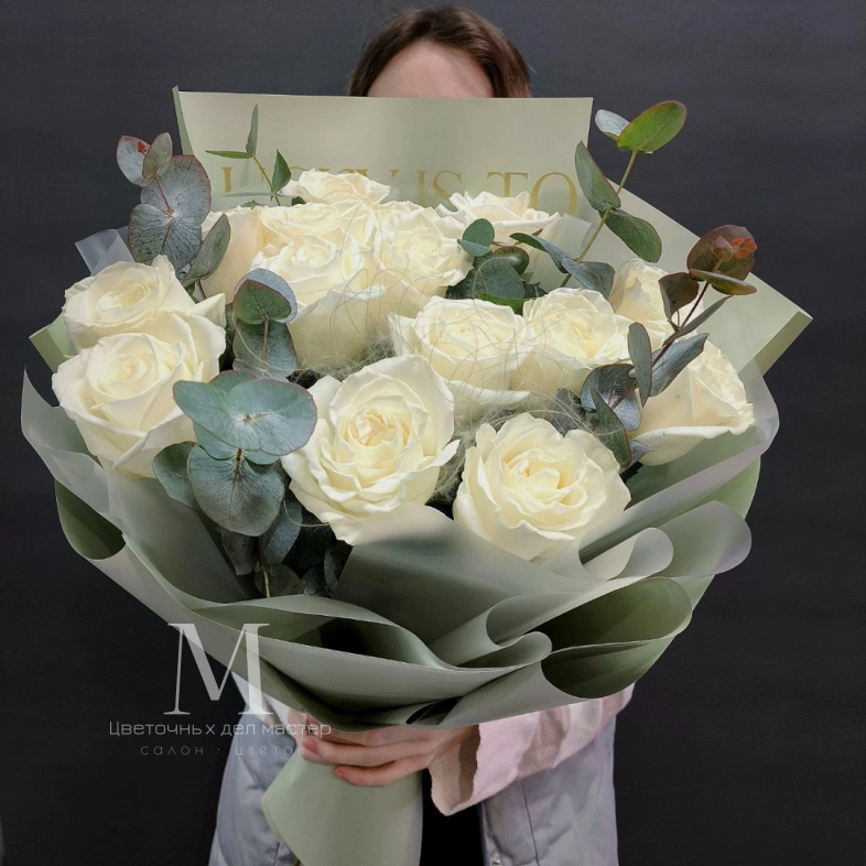 Нежный букет из белых роз Эквадора и веточек эвкалипта.