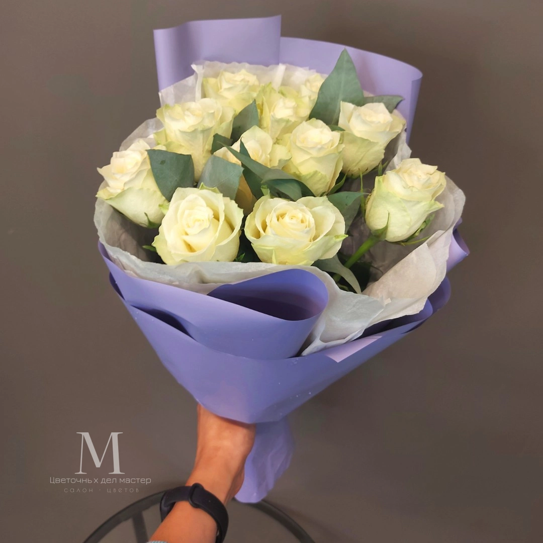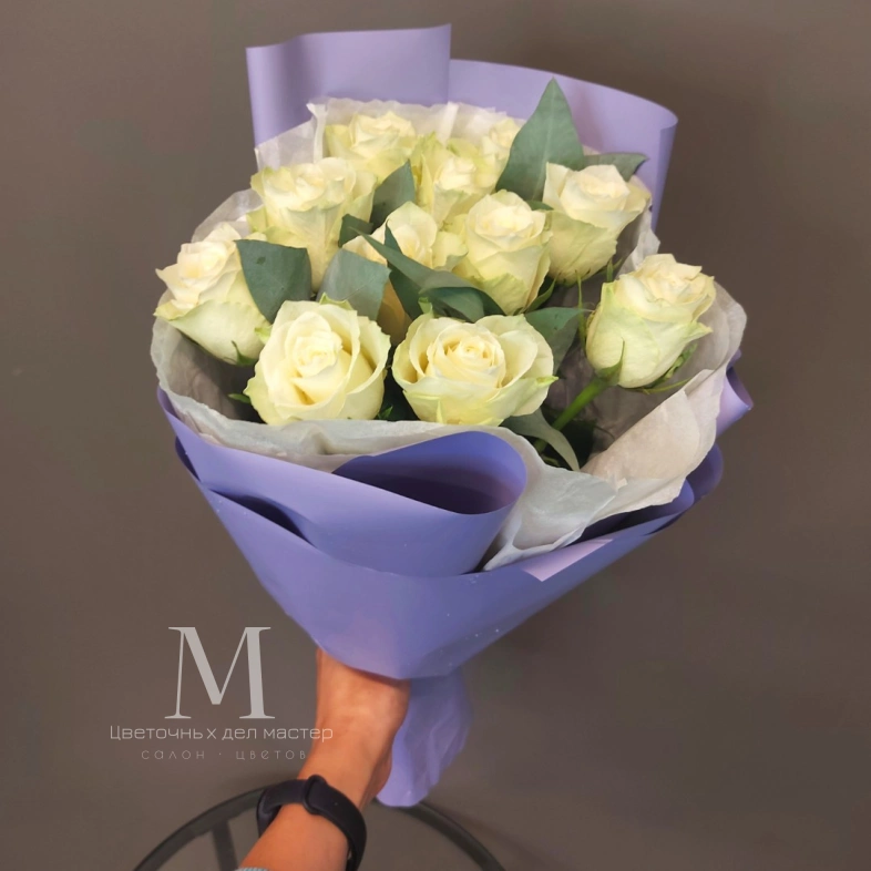 Монобукет из белых роз дополненный ароматным эвкалиптом выразит ваши нежные чувства.