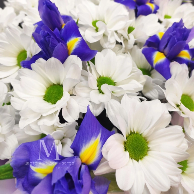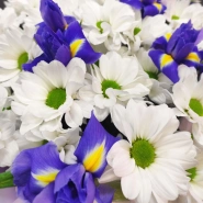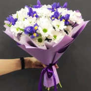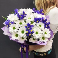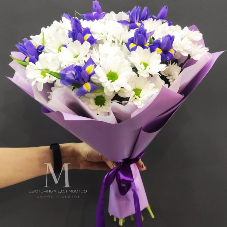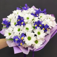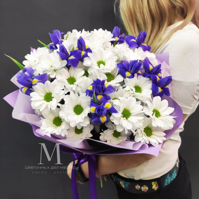 Красивый и яркий букет с ирисами и пышными хризантемами.